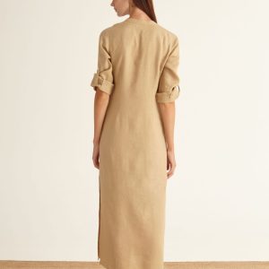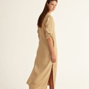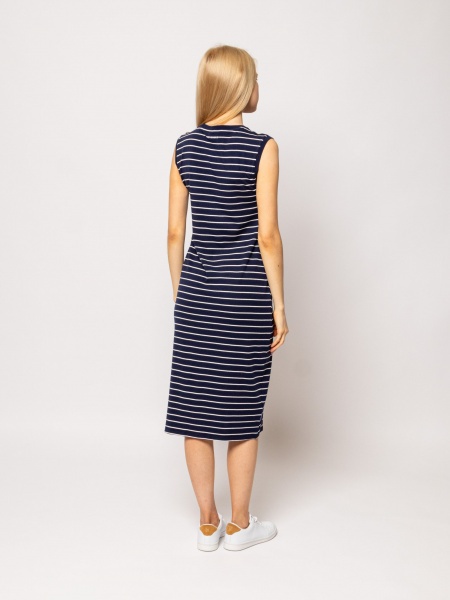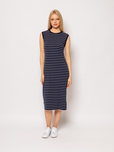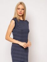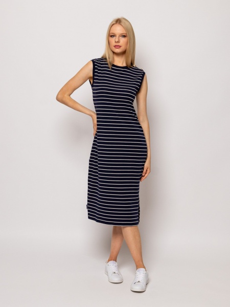 Γυναικείο αμάνικο φόρεμα με ελαφρώς λεπτή εφαρμογή κάτω από το γόνατο, κούμπωμα στους ώμους και λεπτές ρίγες lurex.
