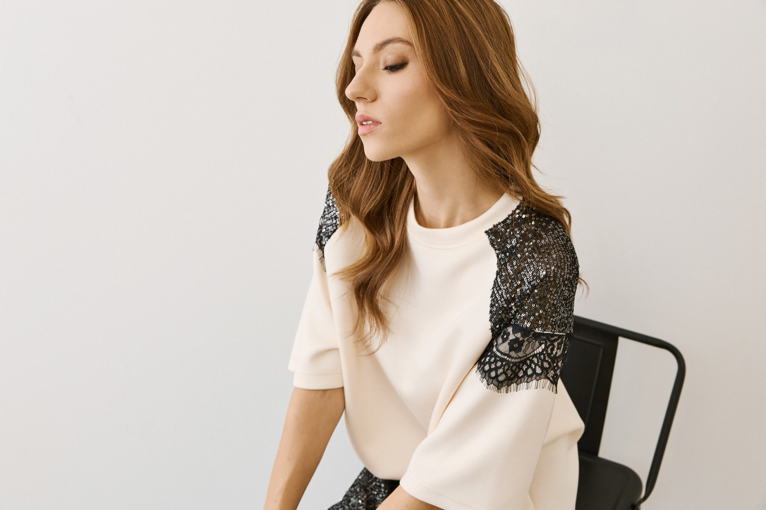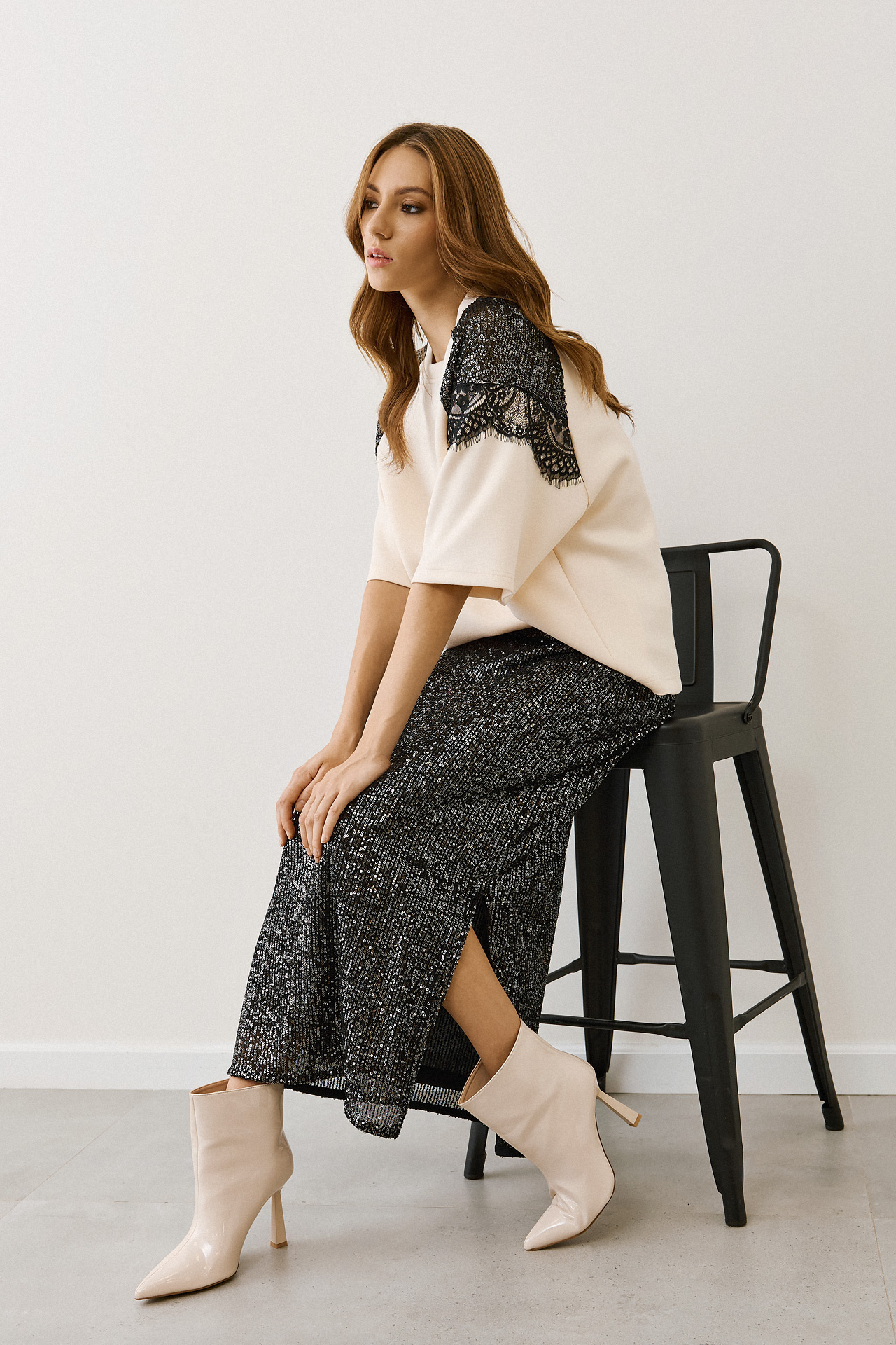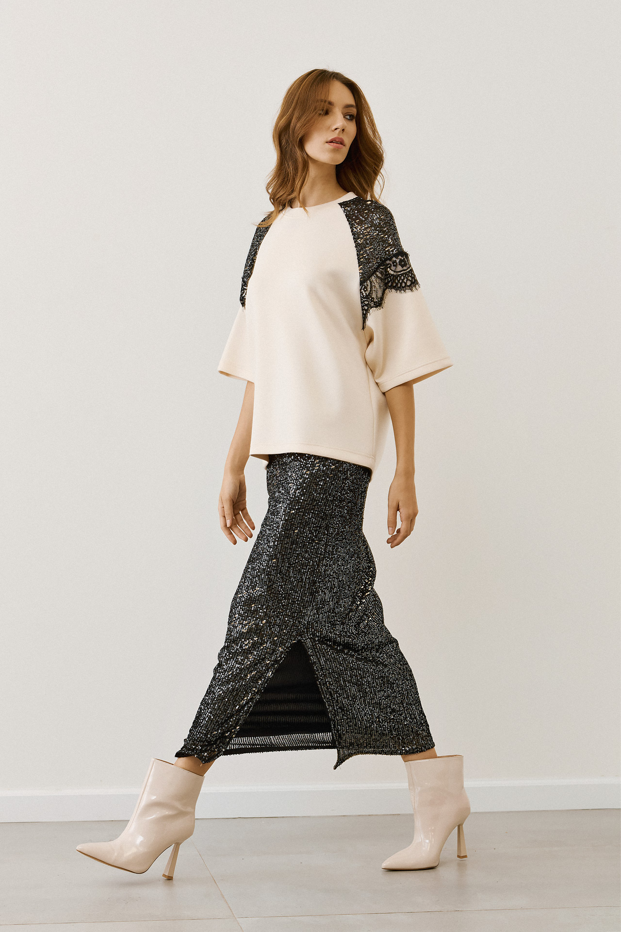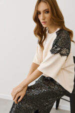 Μπλούζα με παγέτα και δαντέλα στο μανίκι