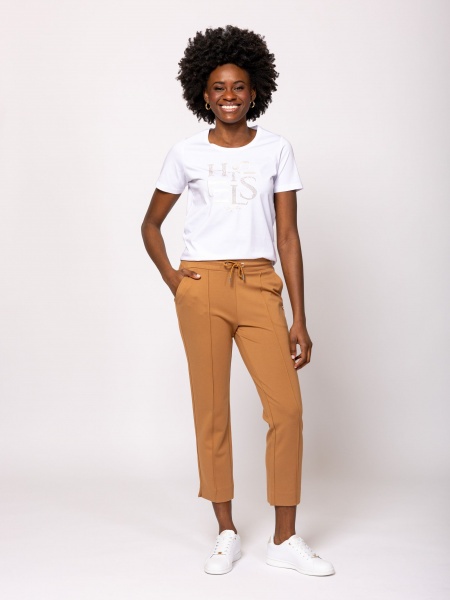 Γυναικείο παντελόνι, άνετο ίσιο κόψιμο, ρυθμιζόμενο κορδόνι, ελαστική μέση, τσέπες, ύφασμα από ψηλή βισκόζη, μικρό μεταλλικό μαρκάρισμα στο μπροστινό μέρος.
