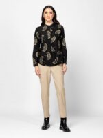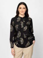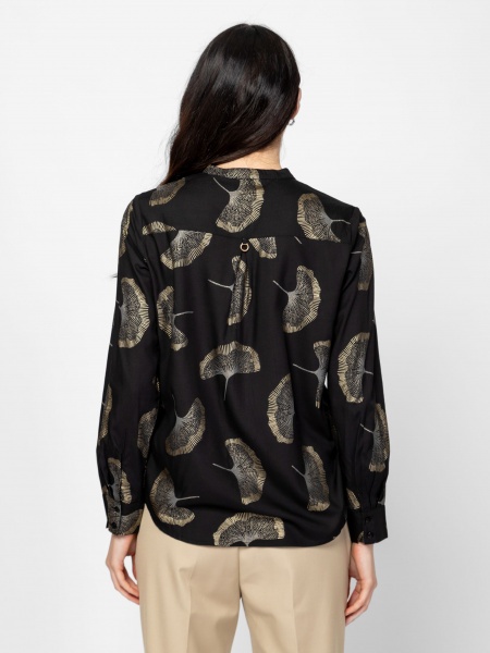 Γυναικείο πουκάμισο με φαρδύ κόψιμο, διακοσμητικός γιακάς όρθιος, κρυφό κούμπωμα, μανσέτες με κουμπιά, ύφασμα βισκόζης στο χέρι, κομψά σχέδια, μικρό μεταλλικό μαρκάρισμα στην πλάτη.