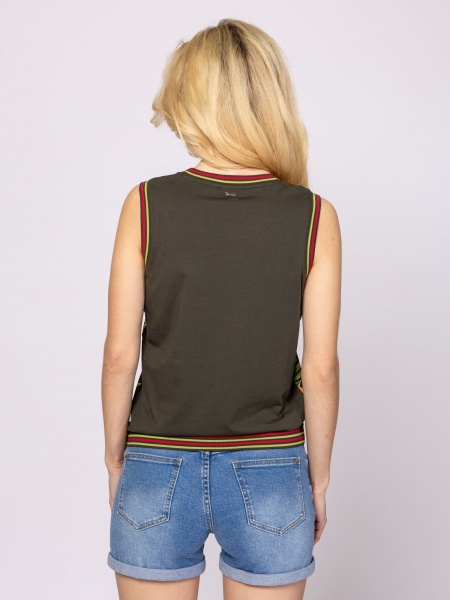 Γυναικείο αμάνικο τοπ με ριγέ στο λαιμό, μανίκια και κάτω μέρος, από άνετο μείγμα βαμβακιού και πολυεστερικό μετάξι με συναρπαστικά σχέδια και ένα μικρό μεταλλικό λογότυπο της μάρκας στην πλάτη.